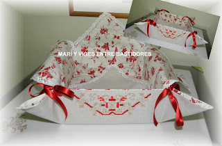 Dos paneras más, en esta ocasión el detalle bordado a punto de lagartera a Máquina. Los motivos de lagartera, igual que el punto de cruz dan mucho juego en trabajos pequeños, resultan vistosos por la variedad de combinaciones que puedes hacer con los colores.